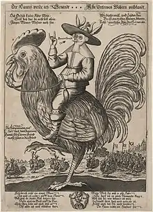Tysk karikatur af en mand med æselører på en kastreret hane, en hahnrei.
