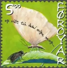 Ein firvaldur - "En sommerfugl". Børnesang af Hans A. Djurhuus, frimærke fra 2003 af Edward Fuglø