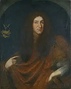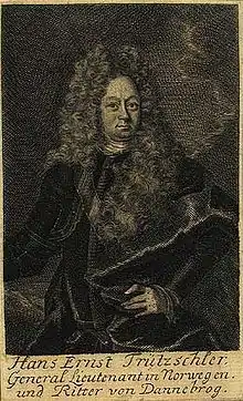 - 3083. Brb. en face, i en Fiirkant. Han bærer Allongeparyk, Rustning, hvorover det hvide Baand og en Kappe over venstre Skulder. Han støtter venstre Arm i Siden, og holder høire Arm udstrakt. 4" 8"’ h. 3" 3’" b. Underskriften er: Hans Ernst Trützschler, General Lieutenant in Norwegen und Ritter von Dannebrog.