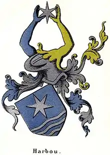 Navnet Harbou eller Harbo, der sættes i forbindelse med Harsyssel, tillægges forskellige jyske adelsslægter, mellem hvilke det ikke synes muligt at påvise forbindelse. 1349 nævnes en Christiern Harthæbo i Ginding Herred, 1446 kendes en Jes Hardbo i Søgaard, og i 16. og 17. århundrede havde en slægt Harbou hjemme på Nielsbygaard i Malt Herred. Den mest udbredte slægt fører i våbenet en stjerne over tre bølger, hvad der tyder på en — ikke påvist — forbindelse med familien Juel eller måske med familien Gyldenstierne, af hvilken slægt ridderen Erik Nielsen 1440 anbefalede udstedelsen af frelsebrev for Knud Nielsen (Harbou). Knud Nielsen fik således frihed og frelse den 8. august 1440 af kong Christoffer på forbøn af hr. Erik Nielsen (Gyldenstierne) og samtidig følgende våben: En seksoddet sølvstjerne over tre sølvstrømme i blåt, på hjelmen to »jomfruarme«, en blå og en grøn, holdende en seksoddet sølvstjerne.