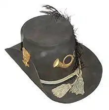 Ifølge regulativerne skulle hatten være udsmykket med et messingemblem og en farvet uldsnor, der angav hvilken våbengren bæreren tilhørte: himmelblå for infanteri, purpurrød for artilleri og minører, gul for kavaleri og signaltropper. Skyggen skulle være bøjet på højre side i kavaleriet og artilleriet og på venstre side i infanteriet.