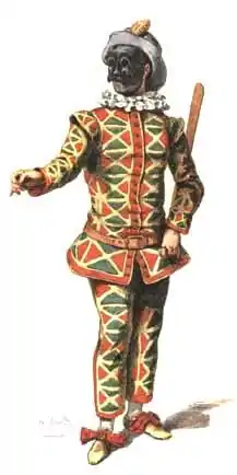 Harlekin var først den ret enfoldige, altid sultne zanno (= tjener) fra Bergamo, akrobatisk og geskæftig; men i 1570'erne blev italienske commedia dell'arte-trupper inviteret til det franske hof, og i Frankrig fik Harlekin en mere central rolle i stykkerne, mens andre masker forsvandt, og nye kom til. Harlekin fremstod nu i varierende skikkelser, fra kejser til tigger, men altid som en komisk og central figur. I 1697 blev truppen dog udvist fra Paris for at have fornærmet Ludvig 14.s veninde, og først i 1716 blev en ny trup budsendt.[6] Nu var Harlekin-figuren også blevet udstyret med en dæmonisk halvmaske og et kort træsværd i bæltet. [7]