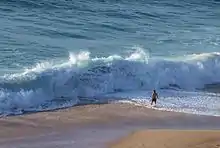 En tsunami er en usædvanlig form for bølge, der kan opstå ved en usædvanligt kraftfuld begivenhed såsom et undervandsjordskælv eller -jordskred, et meteornedslag eller et vulkanudbrud. Disse begivenheder kan midlertidigt løfte eller sænke havoverfladen i det påvirkede område, hvorefter det forskudte havvands potentielle energi bliver til kinetisk energi og skaber en lav bølge, en tsunami, der spreder sig udad ved en hastighed proportionel til vanddybdens kvadratrod, og som derfor bevæger sig meget hurtigere i det åbne hav end på en kontinentalsokkel.[41] I det dybe åbne hav har tsunamier bølgelængder på omkring 130 til 480 kilometer og bevæger sig med en hastighed på mere end 970 km/t),[42] men de opdages sjældent på dette stadie, da de typisk er mindre end en meter høje.[43] I modsætning hertil har overfladehavbølger forårsaget af vind væsentligt mindre bølgelængder, bevæger sig med en hastighed på op til 105 km/t og er op til 14 meter høje.[43]