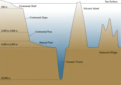 Diagrammatisk krydsdeling af et havbækken, der viser de forskellige geografiske egenskaber