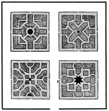 Tidens havekunst, der teknisk set stod ret højt, men som var ganske uberørt af de italienske bevægelser, og som traditionstro klamrede sig til den gamle "kvadratur". Billedet viser et eksempel på inddelingen i disse haver. Kanterne er trukket op med farvede trælister eller buksbom, og i felterne var plantet et broget virvar af blomster, dels stauder, dels étårige sået på blivestedet eller henplantede fra overvintringskælder eller fra "møgbedet". Roserne, der var ret høje buske, plantedes langs det rækværk, der i reglen omgav et indre parti af haven.