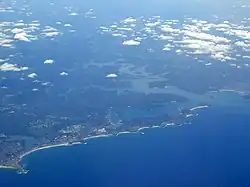 ![]() Luftfoto viser udmundingen af Hawkesbury River, hvor den udmunder i Broken Bay og i det Tasmanske Hav, set med Sydneys Northern Beaches i forgrunden | |