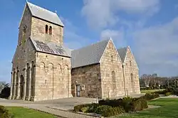 Oprindelig herredskirke. Kirken er opbygget i kraftige granitkvadre. Farvespillet i stenene spænder fra grå til rødt. Den romanske stil leder tanken hen på Ribe Domkirke. Tårnet er tilføjet i 1200-tallet og er efter en nedstyrtning genopbygget i mursten 1721.