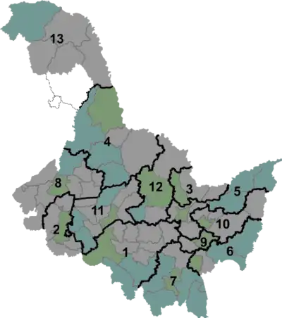 Disse 13 enheder på præfekturniveau er inddelt i 130 enheder på amtsniveau (65 distrikter, 19 byamter, 45 amter og et autonomt amt). Disse er igen inddelt i 1.284 enheder på kommuneniveau (473 bykommuner (towns), 400 kommuner (townships), 58 etniske kommuner (ethnic townships) og 353 subdistrikter).