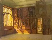 Ligesom det nys nævnte billede købte Den Kongelige Malerisamling også Salle des Francs, en med rigt træskærerarbejde udsmykket sal i rådhuset i Brügge (1858). I de følgende år gengav han efterhånden en hel række indre rum fra Rosenborg, Frederiksborg og Kronborg, på samme tid som han ved at deltage i udgivelsen af Danske Mindesmærker aftegnede en stor del andre danske bygninger. Og selv om der i hans pragtfulde interiører fra Dogepaladset i Venedig (udførte 1870 og flg.) ved originalernes overordentlige rigdom og den ældre kunstners med utrættelig flid opøvede virtuositet gør sig en vis overvægt gældende, ville hans danske billeder ved siden af deres kunstneriske værd have en national interesse, der vil sikre dem en varigere erindring. Hans store gengivelse af Christiansborg Slots Ydre i Parti fra Gammelstrand (1868, Den Kongelige Malerisamling) og hans billeder fra Kronborg og Hven i det nationalhistoriske Museum på Frederiksborg fængsle mindre, til dels fordi kunstneren her vovede sig ind på et område, hvor hans individualitet følte sig mindre hjemme.