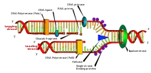 Illustration af DNA-replikation. Helikase ses splitte basepar ad