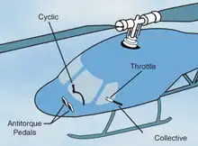 - Ændrer indfaldsvinkel på alle hovedrotorblade samtidigt og er forbundet med motorens/motorernes gasregulering. Ændrer helikopterens vertikale flyveretning: op, ned.