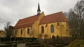 Kirken er gulkalket og har intet tårn, men et spåntækt rytterspir.