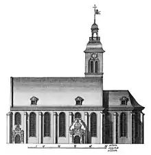 Ved genopbygningen af kirken var det kun dele af ydermuren, der kunne genbruges. Arkitekten J. C. Krieger udarbejdede en plan for genopbygningen, som blev godkendt af Frederik 4. i hans sidste leveår. Kriegers bygning havde samme grundplan som den brændte kirke, men hvor den gamle bygning var i basilikaform med lave sideskibe og fælles tagryg for midterskib og kor, fik den nye sideskibe med samme gesimshøjde som resten af bygningen og fælles tag med midterskibet. Det blev derved højere end korets tag, som også blev afvalmet i østenden, hvor der tidligere havde været en kamtaksgavl, knækket om den polygonale korafslutning.