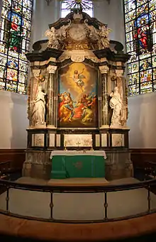 Altertavlen var lavet i 1727 af Diderik Gercken med relieffer og figurer af Just Wiedewelt, og i sin arkitektoniske opbygning, tydeligt inspireret af Tessins altertavle i Vor Frelsers Kirke. Midterpartiet er et himmelfartsbillede af Henrik Krock. I topstykket ses Frederik 4.s portræt og monogram i medallion. Ved opstillingen i Helligåndskirken i 1732 blev Christians 6. monogram med palmegrene tilføjet under medallionen. Over topstykket svæver en helligåndsdue i stråleglans.
