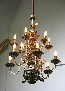 Blandt kirkens mange lysekroner, er der især én, som at værd at læggge mærke til. Den hænger i koret, og er af forgyldt malm med sølvbeslag. Den har 12 arme i to rækker af seks, og i den store kugle er indbygget et urværk med en vandret urskive på undersiden af kuglen. Værket slår kvarter- og timeslag. Kuglen er udsmykket med kerubimhoveder, mellem de to lag arme er anbragt tre faunfigurer, over armene en krone og øverst en pelikanfigur med tre unger, som den nærer med blod fra dens bryst. Blodet er gengivet med en rød sten i indfatning.