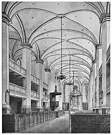Der er ikke overleveret mange informationer om hvordan kirkerummet så ud før branden i 1728. Bygningen havde basilikaform, med lave sideskibe og et højt midterskib med vinduer over sideskibenes tage. Sideskibene har være adskilt fra midterskibet af kraftige arkadebuer, båret af ovale profilerede søjler. Sideskibenes hvælvinger har sandsynligvis været så lave, at der var plads til pulpiturer over dem, eller i hvert fald adgang til pulpiturer. Der har været lukkede herskabsstole til adelsfamilierne, epitafier på væggene og gulvet har været dækket af gravsten. Alt gik tabt ved branden 1728.