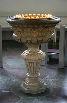 Kirkens dåbsfad er fra 1682, hvor det blev skænket af assessor Hans Nielsen og hustru, som havde gravsted i krypten under fonten.