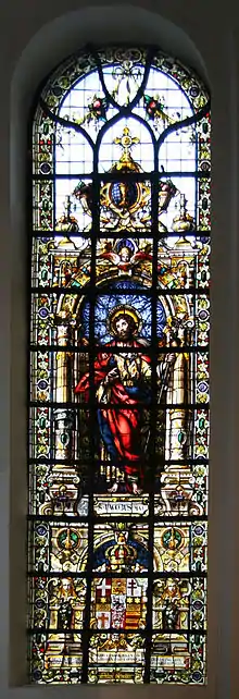 I korets fire vinduer blev der i 1892-94 opsat glasmalerier. I det nordøstvendte vindue ses apostelen Johannes. Billedet er skænket af Georg Bestle og hustru, til minde om Christian 9. og dronning Louises guldbryllup i 1892. I samme anledning blev maleriet i det sydøstvendte vindue skænket af Carl Jacobsen. Det forestiller Jakob den ældre. Jacobsen skænkede også billedet af Maria Magdalene, som sidder i det sydvendte vindue, i anledning af kronprins Frederiks (senere d. 8.) og kronprinsesse Louises sølvbryllup i 1894. Samme år blev i korets midtvindue udført et glasmaleri af August Duvier efter tegning af kunstmaler C.N. Overgaard, forestillende Himmerigets Port, men dette synes at være gået tabt, da der i dag sidder klart glas i vinduet.