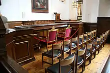 Der vides ikke meget om udseendet af stole og pulpiturer fra før branden. Efter branden blev der opsat nye stolestader, og man ved at Johs. Weiss lavede udskårne topstykker til dem, men heller ikke her kendes udseendet. I 1730'erne omtales 96 stole opbygget på egerammer, så de kunne flyttes, når der var begravelser under kirkegulvet. I 1770'erne blev der sat "tralværk", dvs. små ballustre, på toppen af ryglænene. Da Malling flyttede prædikestolen fra tredje pille fra vest i nordsiden til den nuværende plads, blev stolene også ombygget. De nuværende lukkede stolestader i eg er fra 1940, udformet af Thomas Havning, men med udstrakt anvendelse af døre fra de gamle stader, hvoraf vi må slutte, at der ikke er ændret meget ved deres udformning. I sideskibene er der yderligere langsgående mørkebrune bænke.