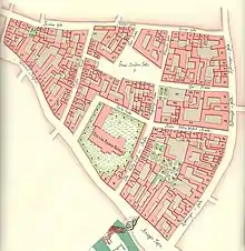 På 1700-tallet omtales de forskellige dele af kirkegården med egne navne, og de har forskellig status. Vestre kirkegård lå mellem Helligåndshuset og den vestre hegnsmur. Søndre kirkegård mellem kirken og Strøget. Vinklen mellem koret og bygningerne i sydøstre hjørne af området, som tilsyneladende altid har ligget der, kaldtes sprøjtehuskirkegården. Østre kirkegård var striben fra korgavlen, langs Lille Helliggeiststræde (nu Niels Hemmingsensgade) op til Valkendorfgade. Endelig var nordre kirkegård den gamle urtegård og området nord for og fra 1710 dog omtalt som søndre hhv. nordre afdeling. Østre kirkegård var forbeholdt fattigbegravelser, mens sprøjtehuskirkegården og nordre afdeling af urtegården var forbeholdt "honette borgerfolk".