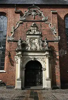 Det er sandsynligt, at portalen oprindeligt var lavet til Børsen, men blev overflødig pga. ændringer under byggeriet. Portalen blev opmagasineret i et par årtier, indtil den blev bestemt for kirken og fik et moderne topstykke. Byggetidspunktet er så omkring 1640. Våbenhuset, som er 8 m bredt og 4 m dybt, har i siderne ovale vinduesglugger fra 1878.