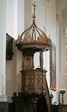 Før branden anvendtes en prædikestol fra begyndelsen af 1600-tallet, doneret af Adam Bødiker og hustru Wendele von Delden. Givernes navne skal have været anbragt på stolen, men ellers vides kun at den senere blev stafferet.