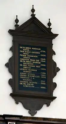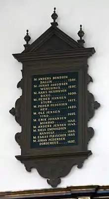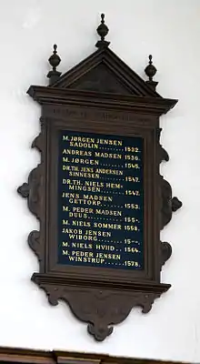 I kirkerummet hænger over pulpiturene fire tavler med navne og årstal for kirkens præster fra 1532 til 1954. Listen fortsætter på en femte tavle, som hænger på våbenhusets vestvæg.