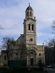 Kirken er treskibet med grundplan som et kors. Den er bygget i romansk og neorenæssancestil. Kirkebygningen består af facadetårnet (finansieret af Juliusz Heinzel), to kapeller, våbenhuse på vest- og østsiden samt sakristiet bag hovedalteret. I alt findes seks altre i kirken.