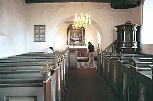 Kor og skib har fladt bjælkeloft, korbuen er ombygget og udvidet. Altertavlen med maleri er fra midten af 1800-tallet. Prædikestolen er fra 1609.