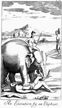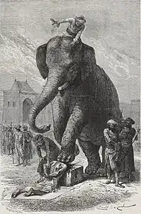 Elefanter var foretrukne bødler i Indien i mange århundreder. Hinduistiske og muslimske herskere henrettede skattesvindlere, rebeller og fjendelige soldater "under elefanternes fødder".[1] Manusmriti eller Manus Love nedskrevet omkring år 200 foreskriver henrettelse af elefanter for flere lovovertrædelser. Hvis ejendom blev stjålet, "burde kongen få enhver tyv fanget og henrettet med elefant."[6]