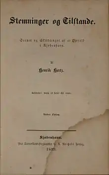 Når Hertz’ dramatiske arbejder viste en så højst forskellig levedygtighed på scenen, lå grunden selvfølgelig dels i deres forskelligartede poetiske værd og dramatiske kraft, dels i publikums ustadige smag; men for en del må den også, i alt fald til en tid, søges i den misgunst, der ramte Hertz på grund af hans politiske konservatisme. Også på dette punkt faldt hans anskuelser sammen med Heibergs, og af den uvilje, der fra de liberale ordføreres side rettedes mod denne, fik også Hertz sin part, især efter at han 1839 havde lagt sin politiske trosbekendelse åbent for dagen i novellen Stemninger og Tilstande, i hvilken han uden lidenskab, nærmest som beskuer, men ofte med rammende ord udtalte sin dom om tidens bevægelser. ”Det politiske Element, der er optaget i denne Bog”, siger han i sine autobiografiske optegnelser, ”har givet vore Oppositionsblade, der ere Part i Sagen, Anledning til en Mængde mat gennemført Polemik, som jeg hidtil har ladet ubesvaret, da den for største Delen finder sin Besvarelse i selve Bogen. At den Anskuelse af vore nyere politiske Forhold samt af Oppositionspartiets Fremfærd, jeg i denne Bog har søgt at gøre gældende, nu hyppig og fra flere Kanter kommer til Orde, tør jeg måske for en liden Part regne mig til Fortjeneste.” Bogen udkom i alt fald i to oplag med kort mellemrum, hvilket ikke bidrog til at mildne stemningen mod dens forfatter. De arbejder, han bragte på scenen i de nærmeste år her omkring, fik da også for det meste kun en tynd lykke: Valdemar Atterdag opnåede kun tre, Svanehammen fem, Fristelsen fem og Amanda fire opførelser, og et lille lejlighedsstykke, Perspektivkassen, skrevet til en sommerforestilling 1842, fremkaldte angreb, hvis heftighed og langvarighed stod i absolut misforhold til den ubetydelige anledning. Det er under disse forhold meget betegnende, at Hertz lod Kong Renes Datter opføre anonymt og først navngav sig, efter at stykkets succes var sikret. I den polemiske komedie Hundrede År, skreven i anledning af teaterjubilæet 1848, gør Hertz sig dog delvis til talsmand for en slags parlamentarisk styrelse af skuepladsen, medens han også her viser sit mod til at gå imod strømmen, i det han advarer imod at lade sværdet overskære også de åndelige bånd, der forbinde dansk og tysk kultur med hinanden. Omtrent samtidig med dette værk skrev han det oldnordiske digt Tyrfing, som udkom med tegninger af Constantin Hansen.[14]
