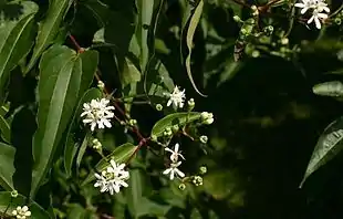 Blomstringen sker i september fra spidsen af etårsskuddene. Blomsterne er samlet i små stande af hvide, fint duftende enkeltblomster. Når blomsterne falder af, bliver de mørkerøde bægerblade siddende. Frugterne modner – så vidt vides – ikke her i landet.