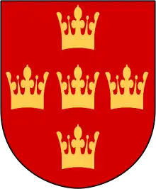 - Skjold: I rødt fem i kors stillede guld kroner.