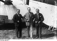 Besætningen på Bremen inden flyvningen over Atlanterhavet. Fra venstre Hermann Köhl, Günther von Hünefeld og piloten Fritz Loose. Losse deltog ikke i selve flyvningen over Atlanten.