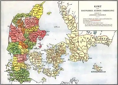 Ordet "herred" anvendes første gang i Norden i Knud den Helliges gavebrev fra 1085, hvori en række godsgaver til kirken i Lund stedfæstes til de sjællandske herreder, hvori de lå; derimod er det ikke tilfældet for de modsvarende godsgaver i Skåne. Den danske herredsinddeling kendes første gang fra Kong Valdemars Jordebog fra omkring 1232. Her er hele landet inddelt i henved 200 herreder, og Jylland tillige i 14 sysler overordnet herrederne. Herreds- og sysselinddelingen anvendes i det såkaldte "hovedstykke". Fra omtrent samme tid stammer de ældste landskabslove, der viser, at herreds- og sysselinddelingerne var faste retsinddelinger under landstinget. Herredsinddelingen synes ikke at være ældre end begyndelsen af middelalderen (måske slutningen af vikingetiden).[2]