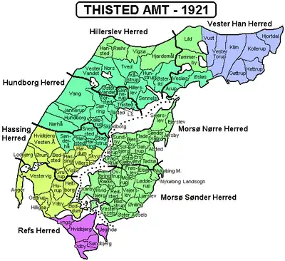 Thisted Amt. Med grønne nuancer er indtegnet kommuner, der efter Kommunalreformen i 1970 gik til Viborg Amt, med lilla et område, der blev til en kommune i Ringkjøbing Amt, og med blåt et område, der gik til Nordjyllands Amt.