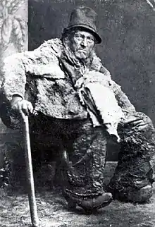 | „ | Saa kørte Vognen, og jeg gik ogsaa med mit Indkøb, en dejlig Pibe med blaat Porcelænshoved med det yndigste Maleri paa hjem ad den sandede Vej. Her naaede jeg en gammel Kone, der trak med en velholdt gammel Ko; en lille Bylt i et broget Klæde hang paa det ene Horn, Tøjret havde hun paa den anden Arm, mens hun flittigt strikkede paa en Strømpe. | “ |