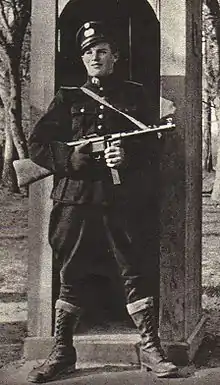 Dansk HIPO-betjent på vagt ved Schalburgskolen, som lå på Høveltegård.