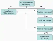 Førstehjælpen til bevidstløse personer følger de almindelige fire af førstehjælpens hovedpunkter. Der er dog ved en særlig fremgangsmåde ved den livreddende førstehjælp (A-B-C),[4] som du bør følge. Se diagrammet. Af diagrammet fremgår det, at man skal placere folk ved bevidsthed i "Aflåst sideleje" - dette er af to årsager ikke korrekt. For det første er betegnelsen i dag "Stabilt sideleje" dette er ikke blot en ændring af betegnelsen, men rent faktisk også af selve lejringen. For det andet er "Stabilt sideleje" møntet på bevidstløse med en normal vejrtrækning. Taler vi f.eks. om en astmatiker eller en person med et andet respiratorisk problem. Vil det ikke være hensigtsmæssigt og formodentlig heller ikke muligt, at placere denne person i denne lejring. Personen vil blive unødigt fysisk belastet og stritte i øvrigt imod denne lejring.