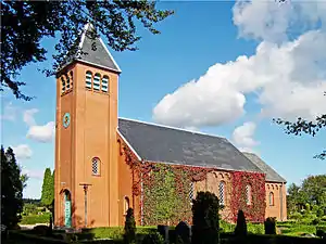 Kirken er opført i tegl i nyromansk stil. Taget er i skifer.[1]