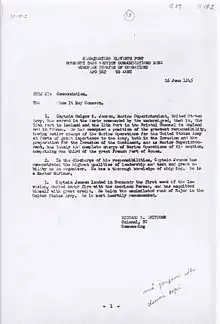 | Holger Jensen, der er dansk statsborger, udførte fortjenstfuld tjeneste fra juni 1942 til maj 1945 som Skibsinspektør ved US Army. Uden karrighed brugte han sine mange års erfaring ved at arbejde med skibe, gods og mennesker, og ved at gøre tjeneste i den europæiske krigszone i mere end tre år bidrog han til det heldige udfald af krigen mod Tyskland, idet han udviste en ubøjelig årvågenhed for godsets og menneskers sikkerhed og med den styrke kombineret med taktik med hvilken han lod sin erfaring, evner og personlighed virke gennem den militære organisation han arbejdede for, samt ved sin grænseløse loyalitet til sin organisation og dens sag. Yours sincerely, Josiah Marvel, Jr. American Ambassador. The American Embassy. Office of Military Attché, Copenhagen. | ||