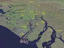 Floderne Bergse Maas og Nieuwe Merwede løber sammen nær Lage Zwaluwe og danner den brede flod Hollands Diep. Floden Dordtsche Kil løber ind ved Moerdijk. Nær Numansdorp deler Hollands Diep sig i floderne Haringvliet and the Volkerak.