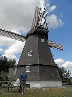 Den anden type er opbygget med undermølle i grundmur og udstyret med galleri, hvorfra den kan krøjes, påsættes sejl og bremses. En hollandsk vindmølle har oftest fire vinger, der udgøres af to vingearme. De to vingearme sidder forskudt for hinanden i akselhovedet. Vingerne har enten hækværk til sejl eller selsvikkende klapper.[6]