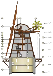 Etagerne i hollandske vindmøller betegnes som lofter. Broloftet er det underste, herefter følger kværnloft, lorrisloft med hejseværk og hatloft[note 1] Under broloftet kan der være en undermølle og eller en kælder. Nogle eksemplarer af de hollandske møller, især blandt tårnmøllerne, har yderligere et eller flere lofter.