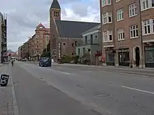 Holmbladsgade set i retning mod Amagerbrogade i baggrunden. Midt i billedet Nathanaels Kirke.