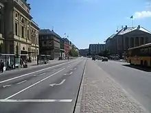 På hjørnet af Kongens Nytorv ligger Det Kongelige Teater. Teatrets nuværende bygning blev opført i 1872-1874 efter tegninger af Vilhelm Dahlerup og Ove Petersen. Bygningen er stærkt påvirket af Opéra Garnier i Paris. I det festligt indrettede teaterrum var der oprindeligt plads til 1.600 tilskuere.[6] Bag teatret blev der opført en magasinbygning, der blev forbundet med teatret med en mellembygning over Heibergsgade, der dengang fortsatte til Holmens Kanal. Magasinbygningen og mellembygningen blev erstattet af en ny tilbygning til teatret i 1983-1986, hvilket betød at denne del af Heibergsgade blev nedlagt. En hjørnebygning med prøvesal og musikarkiv fik dog lov at overleve.[7][8][9]