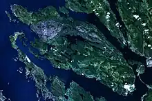 Frekhaug, som er den tidligere Meland kommunes administrationscenter, er øens største by. Højeste punkt er Eldsfjellet med 324 moh. og den største sø er Storavatnet.