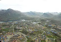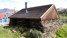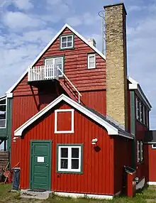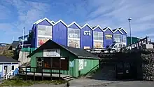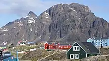 Forskellige typer af bebyggelse i Sisimiut, et præfabrikeret enfamilieshus (venstre) og lejlighedsblokke fra 1960'erne (højre). | ||