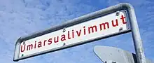 - Navnet kommer fra umiaq (en kvindes båd) med -suaq- endelse (den store båd). Dette bliver til umiarsualivik, stedet med store både, eller havn, hvilket fører til det endelige ord, umiarsualivimmut: til havnen eller mere simpelt bare Havnevej