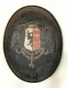 Skjoldet delt af sølv, hvori en halv grå ørn, fast på delingen, og guld, hvori tre røde bjælker, slægtens gamle mærker, to hjelme, den højre – heraldisk regnet – bærende en guld strudsfjer mellem to røde, den venstre et rødt og et sølv vesselhorn, skjoldholdere to tilbageseende grå ørne.